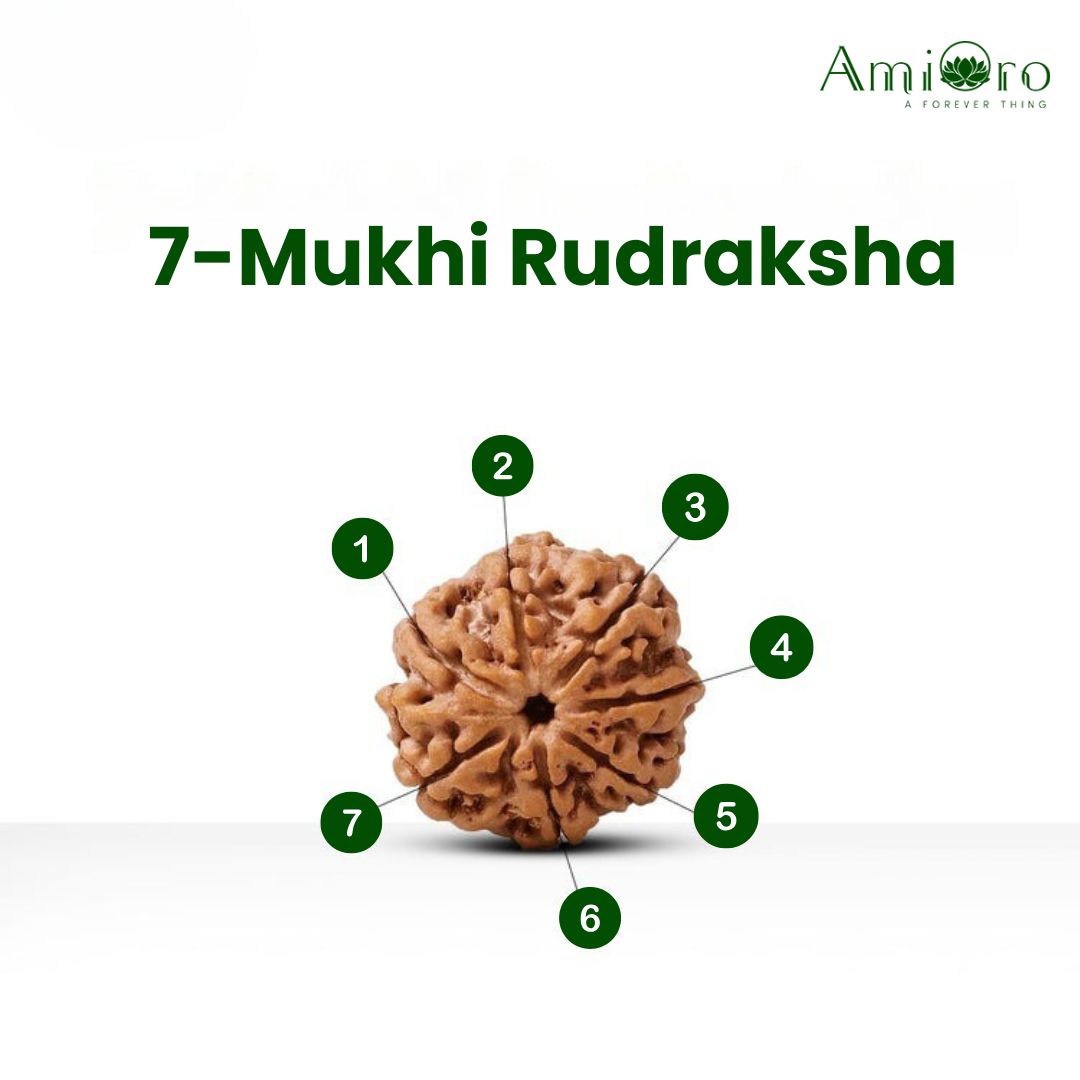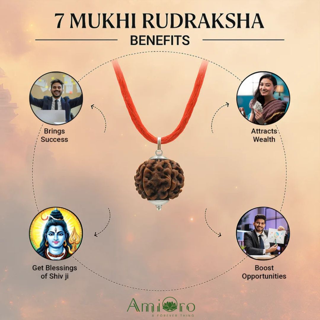 The seven faces of the Rudraksha represent the seven chakras, promoting spiritual enlightenment and personal growth. It is believed to open doors to success, whether in career, education, or relationships, by fostering confidence, clarity, and focus.
