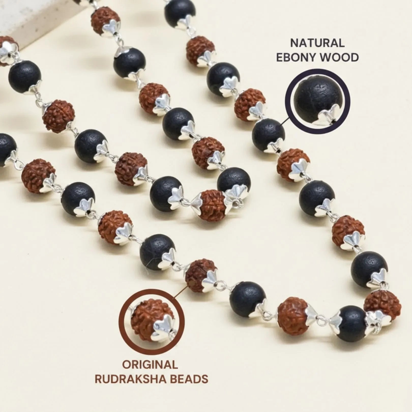 Rudraksha strengthens spiritual awareness and devotion, and Karungali supports grounding and stability. Wearing them together is believed to help the wearer stay spiritually connected and focused during prayer or meditation.