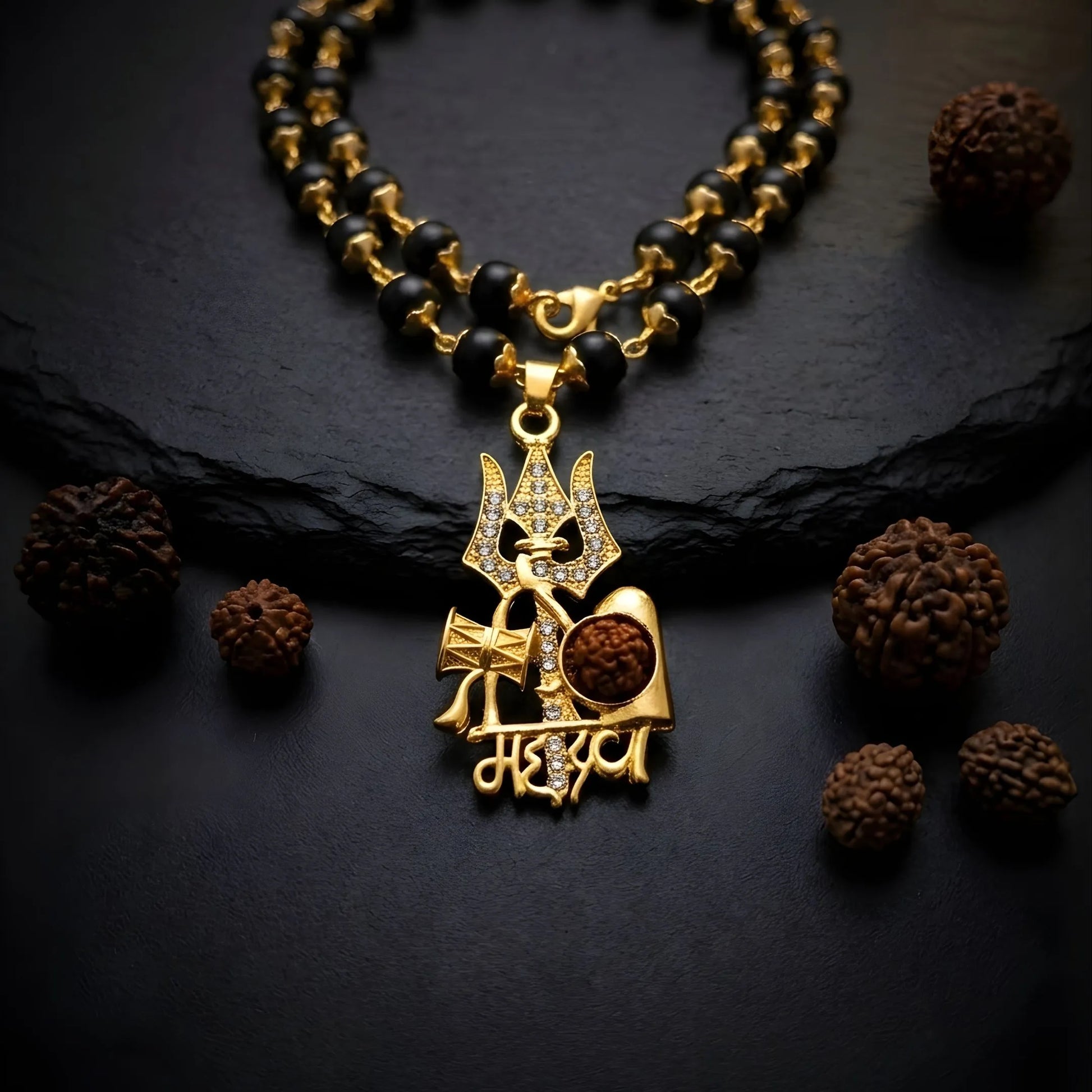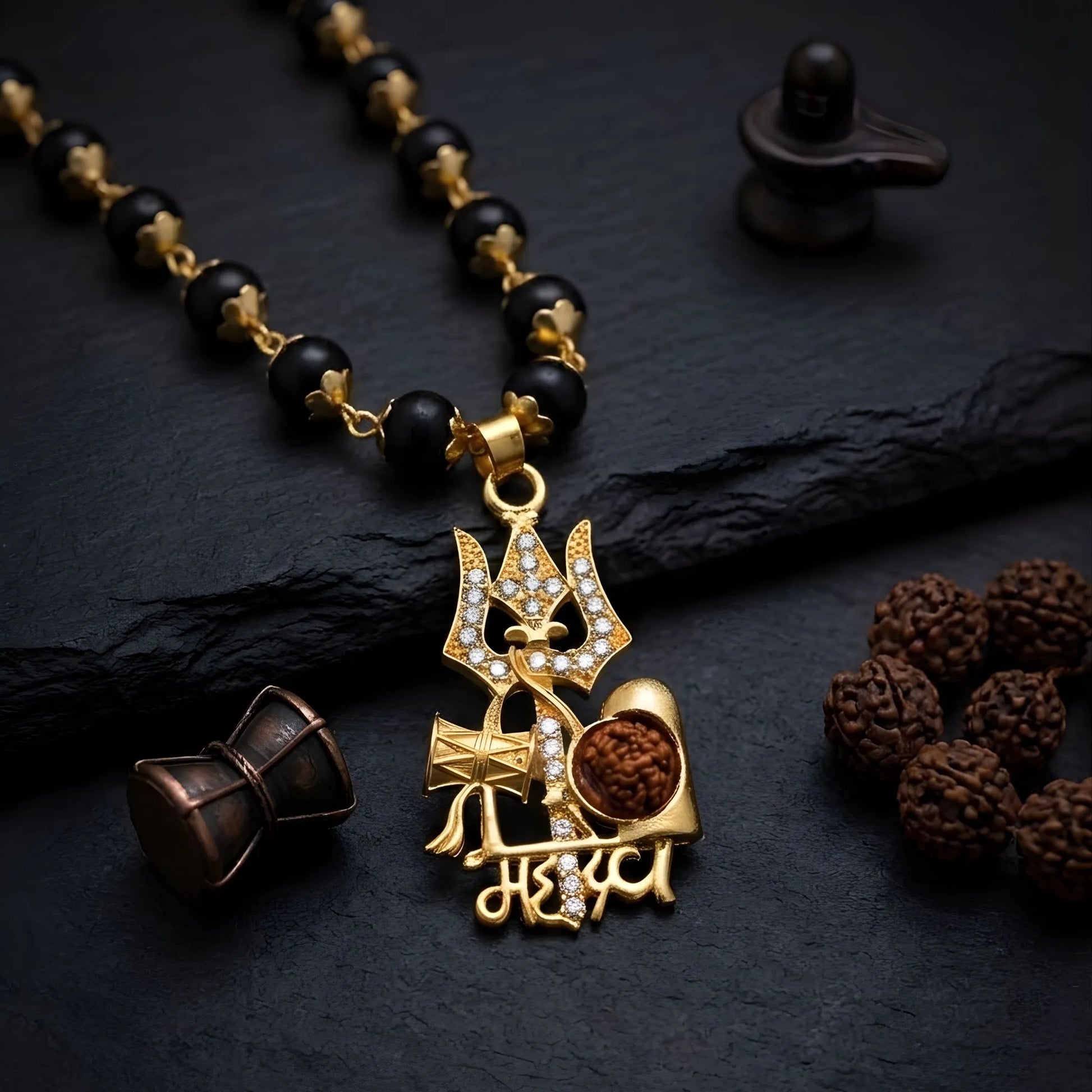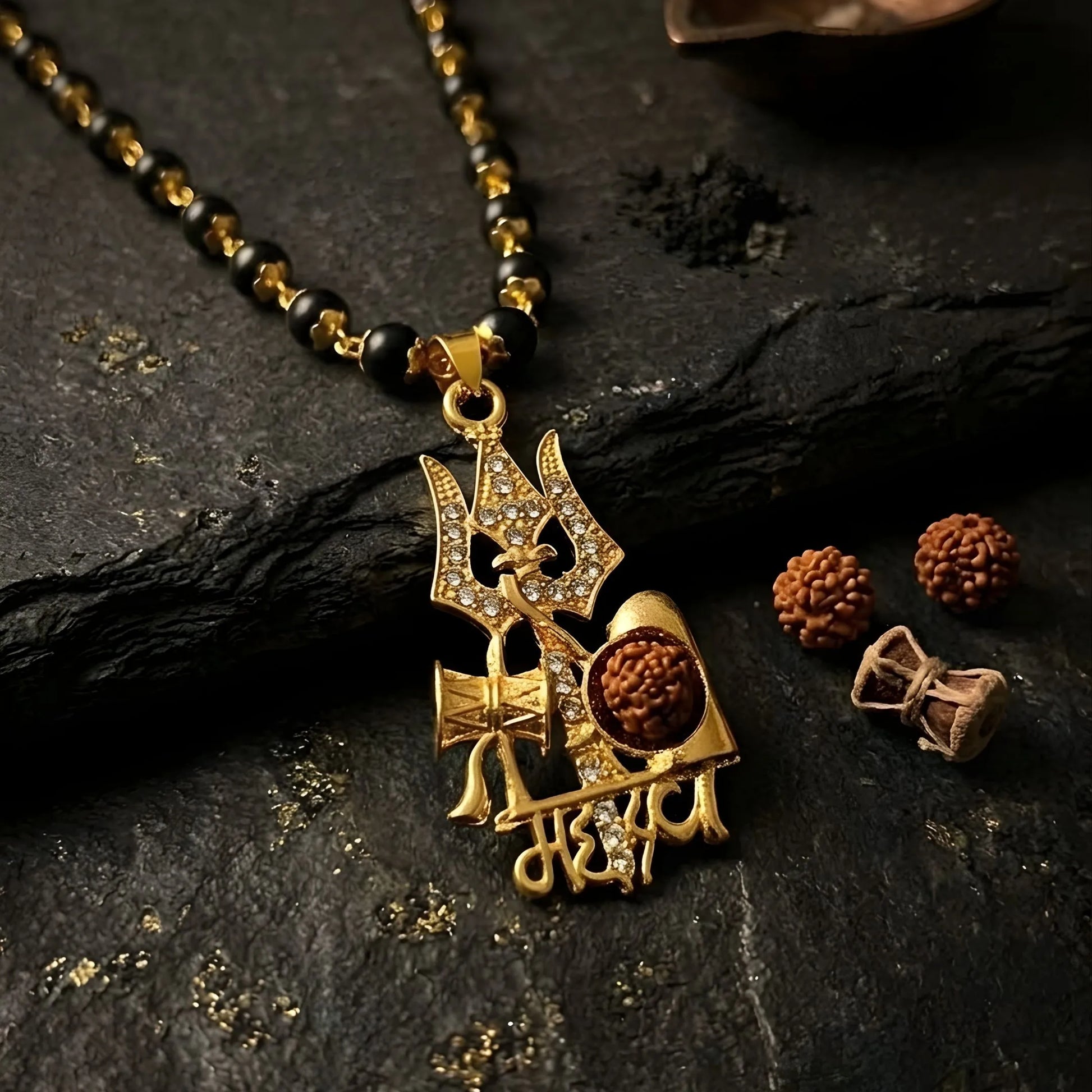 Welcome the blessings of Lord Shiva into your life with the Amioro Gold Plated Mahadev Pendant with Gold Cap Karungali Malai and experience divine protection, strength, and spiritual positivity every day.