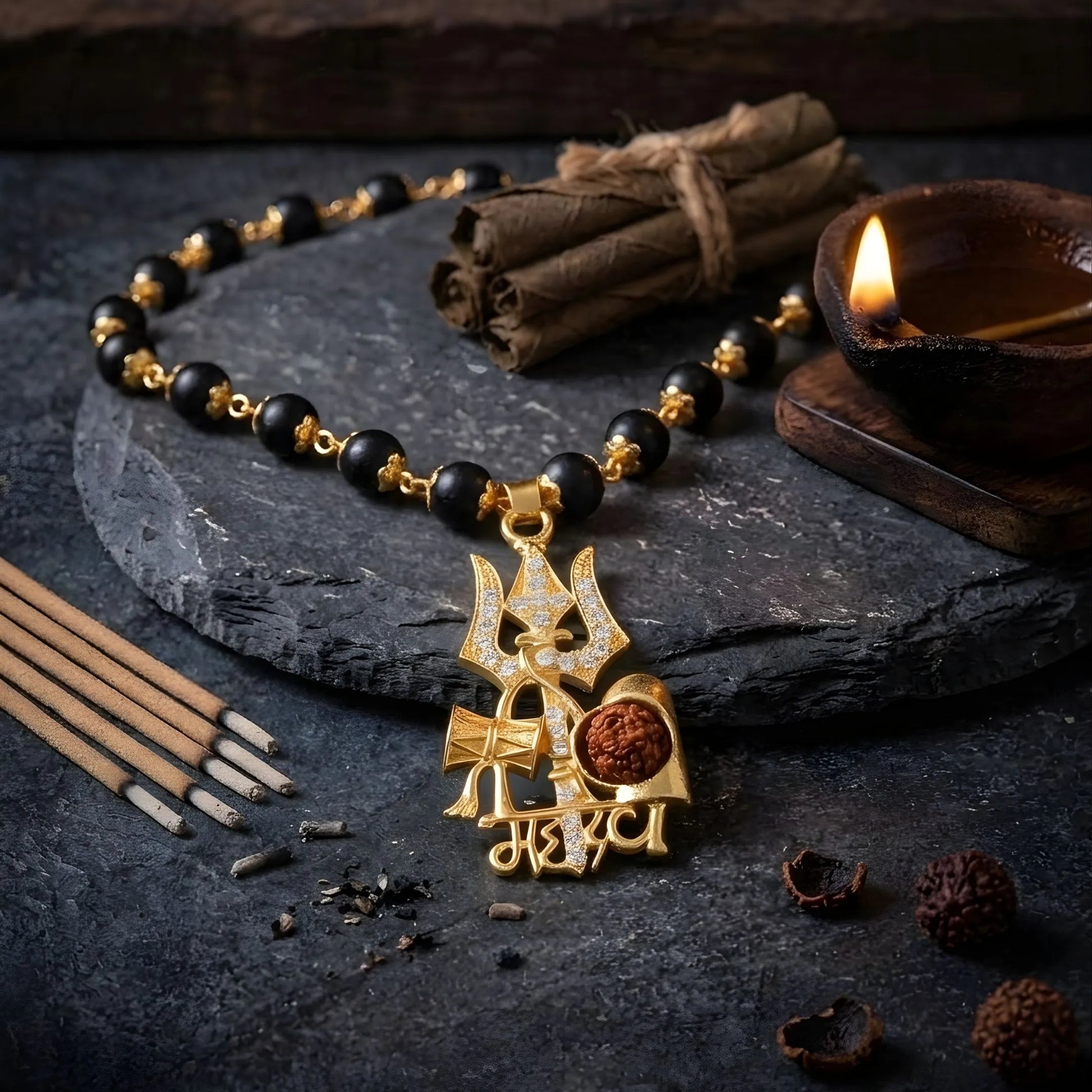 Gold Plated Mahadev Pendant with Gold Cap Karungali Malai | Divine Protection, Strength & Spiritual Peace