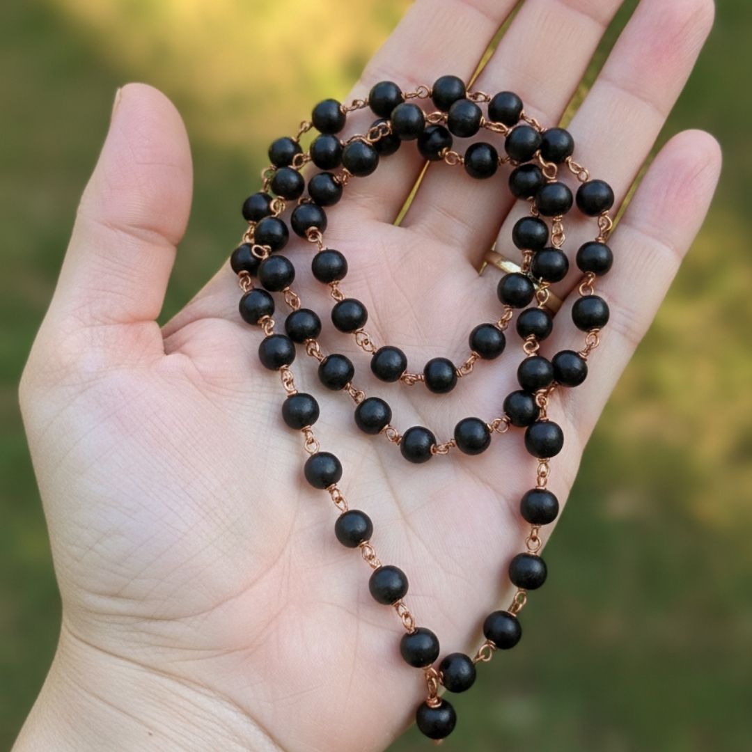 Karungali has been used for centuries by saints, siddhars, and spiritual practitioners to ward off negative energies, remove fear, and bring mental stability. Wearing or chanting with a Karungali malai is believed to improve focus during meditation, strengthen self-confidence, and create a protective aura around the wearer. The copper wire not only adds durability but is also believed to balance bodily energies and amplify the malai’s spiritual benefits.
