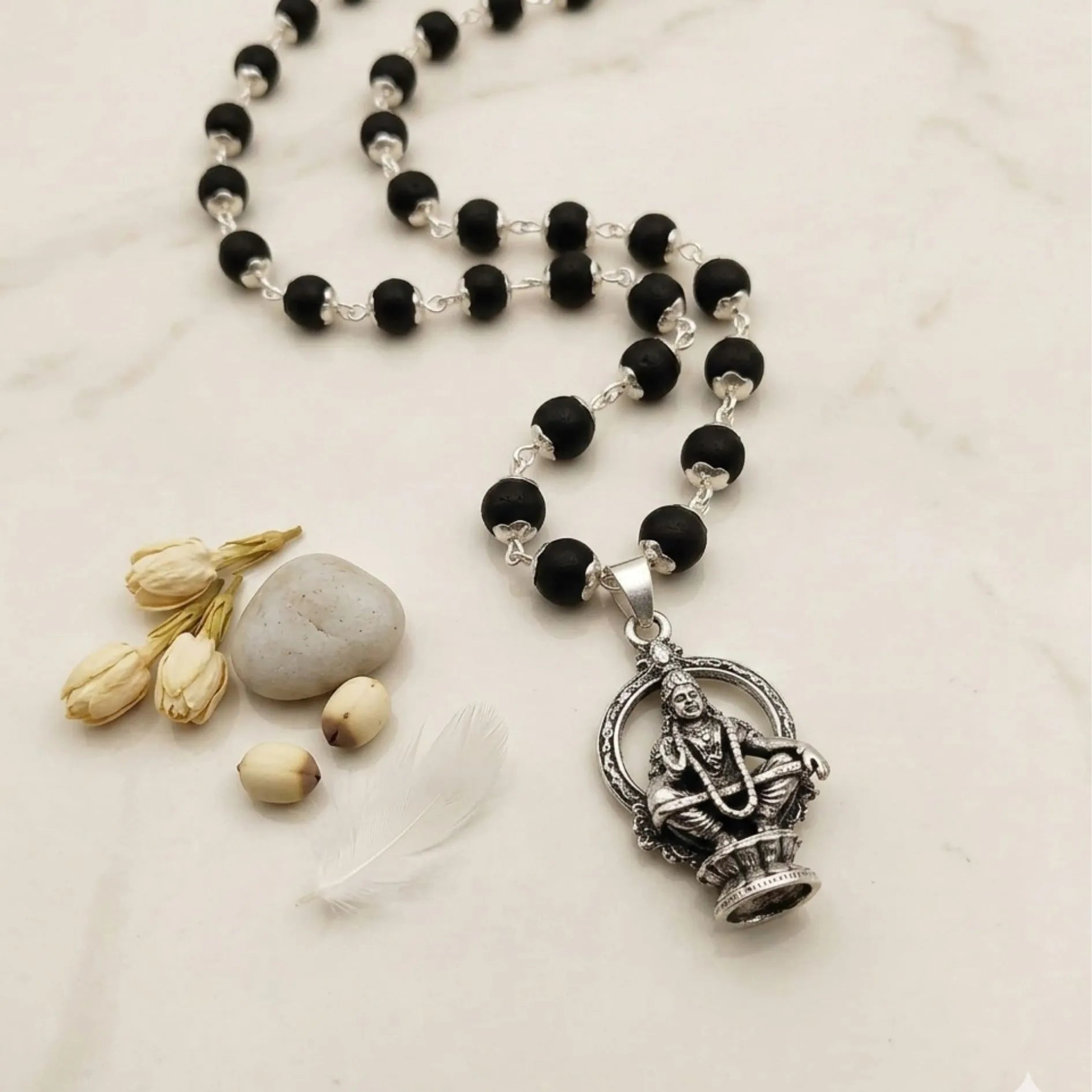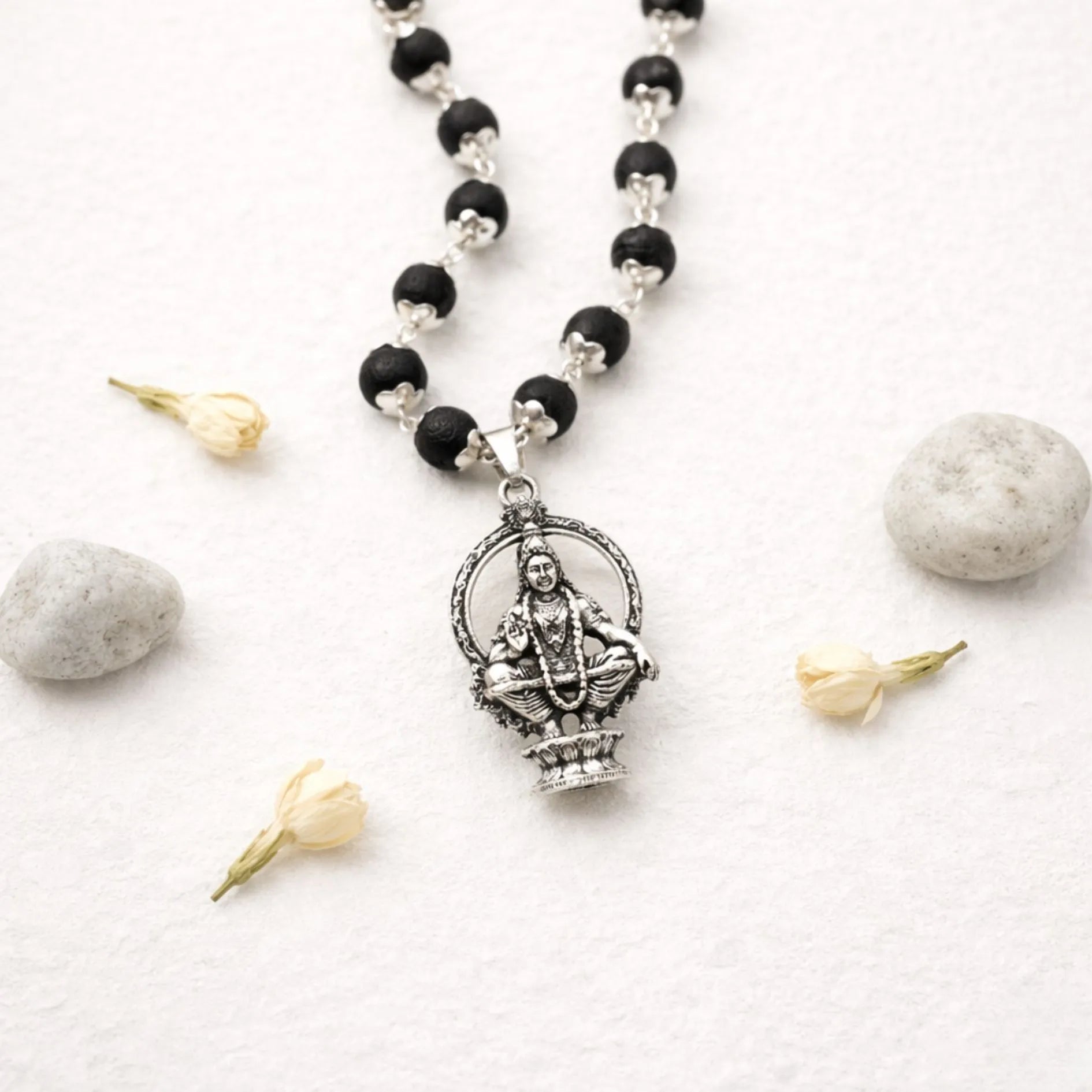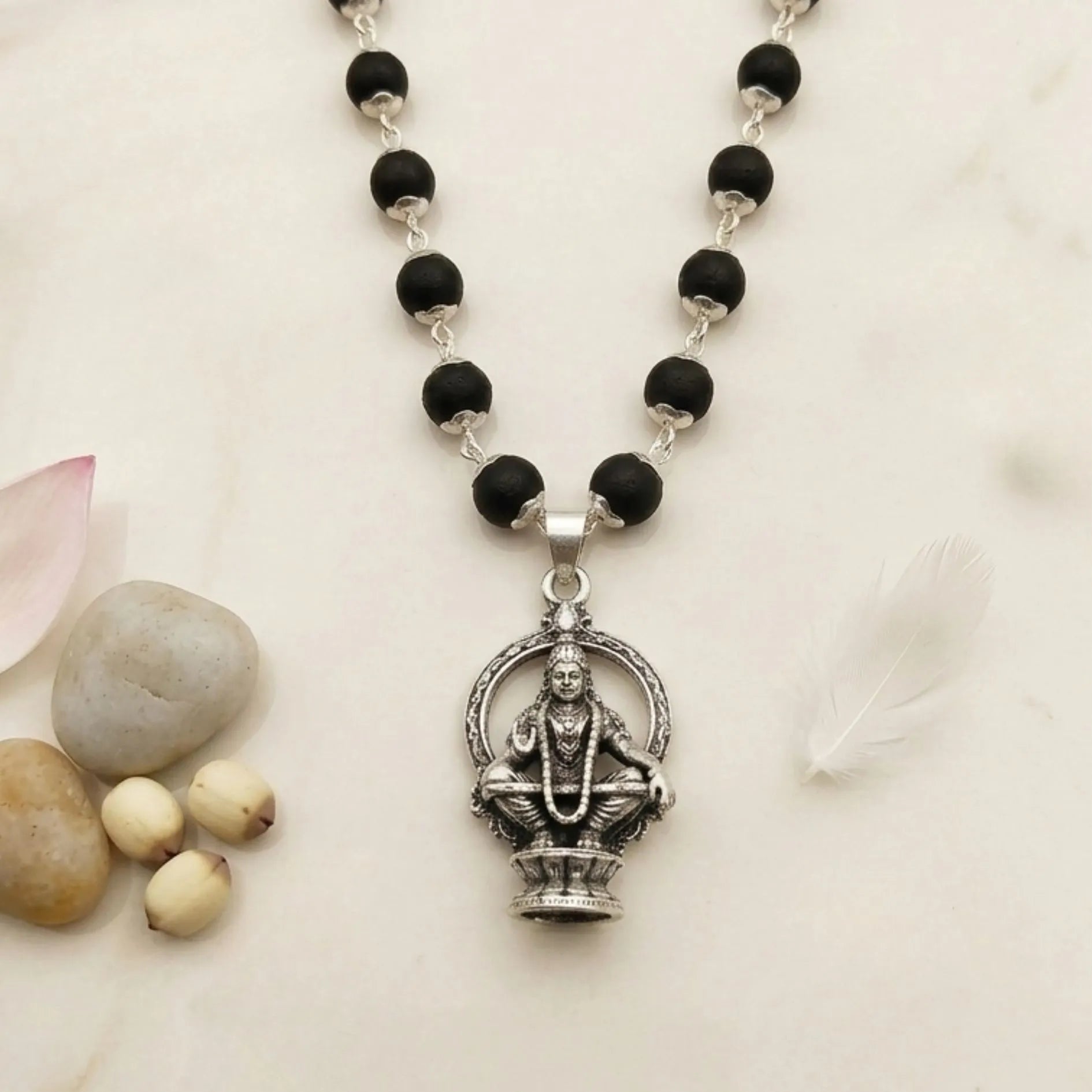 Lord Ayyappa Pendant with Silver Capped Karungali Malai | Protection, Discipline & Divine Blessings