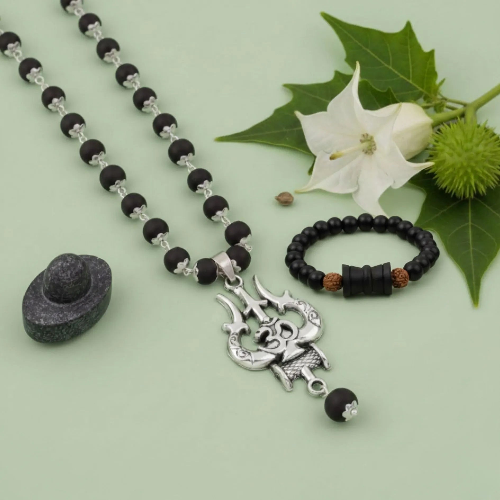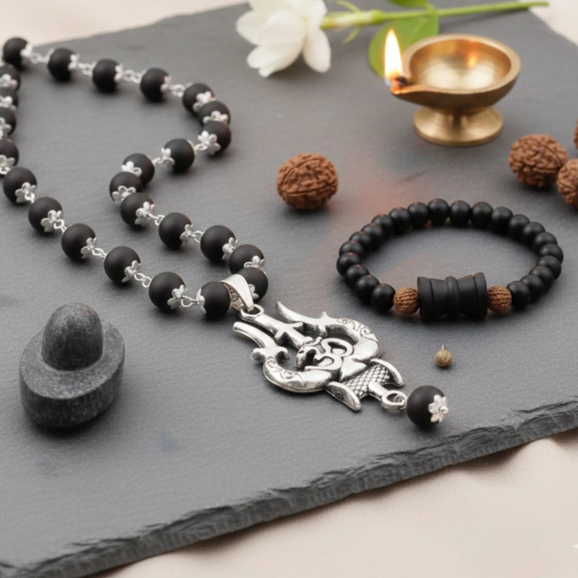 The OM Shiva Trishool Karungali Mala represents divine protection and stability, while the Damru Rudraksha Bracelet symbolizes spiritual awakening and balance. Together they form a unique and original pairing created for those seeking peace, protection, and a deeper connection with Lord Shiva.