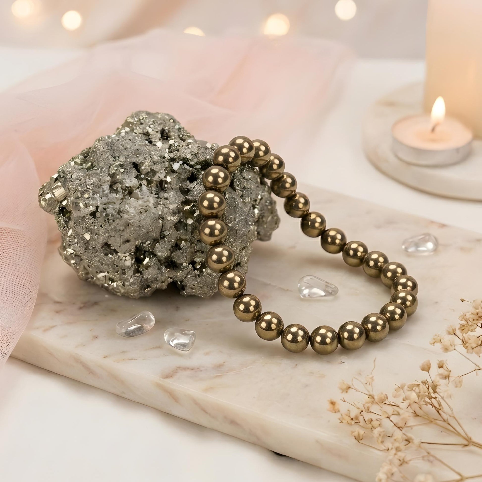The energy of Pyrite promotes courage, determination, and self-belief. Wearing the bracelet and keeping the raw stone nearby helps improve decision-making and leadership qualities.